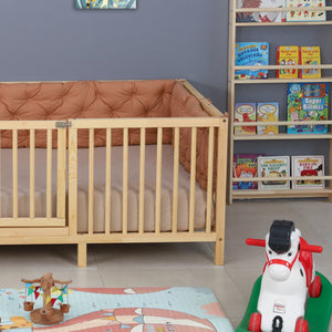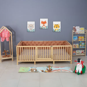 A floor-level Montessori playpen bed featuring cylindrical railings available in three heights (17", 19", 23") plus a built-in gate for added security. Crafted from solid wood, this twin-size frame (mattress sold separately) supports independent play and safe rest.